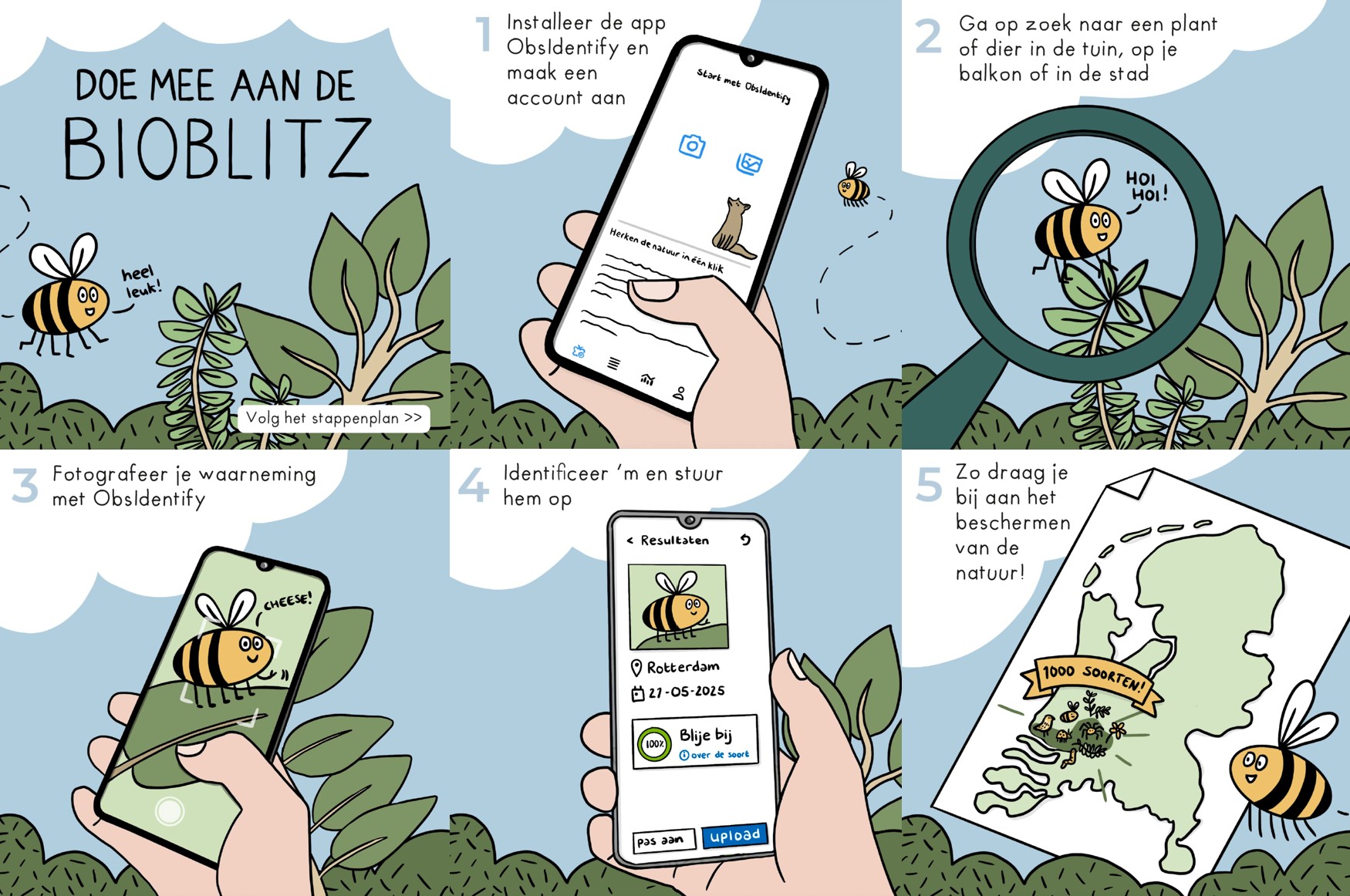 Als je op deze dag een soort ziet en deze invoert op Waarneming.nl, draag je automatisch bij. Je kunt overal binnen de Rotterdamse gemeentegrenzen meetellen: van de Tweede Maasvlakte en Hoek van Holland helemaal tot aan Nesselande. Wel tellen alleen de wilde soorten, dus je eigen huiskat, exotische tuinplanten of de stokstaartjes uit Blijdorp kunnen helaas niet meedoen. Dus, ben jij op vrijdag 22 mei in Rotterdam en zie je een pimpelmees in je tuin, herderstasje tussen de tegels, een ruisvoorn in de sloot, of een atalanta in het park, geef het door via Waarneming.nl. Tip: de app ObsIdentify helpt je om vast te stellen met wat voor plant of dier je te maken hebt, en zorgt dat de soorten die je ziet automatisch meedoen aan de Bioblitz. Samen brengen we zo de biodiversiteit van Rotterdam in beeld!