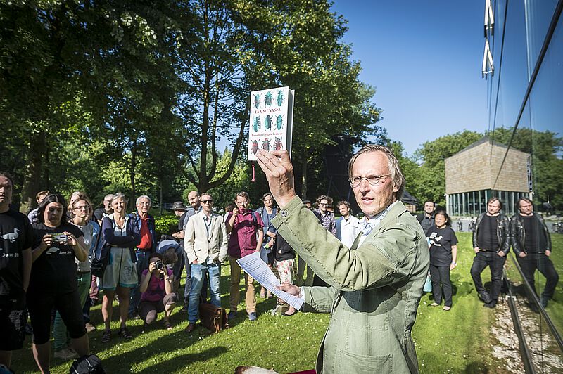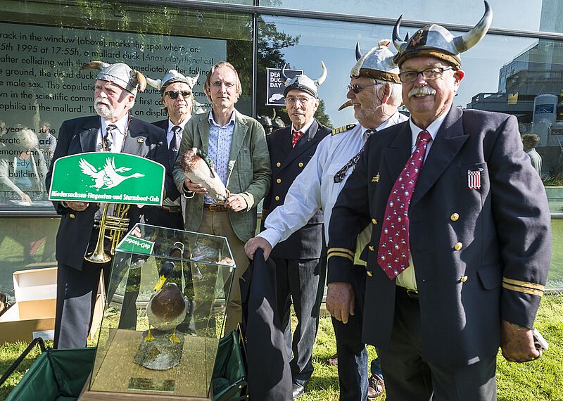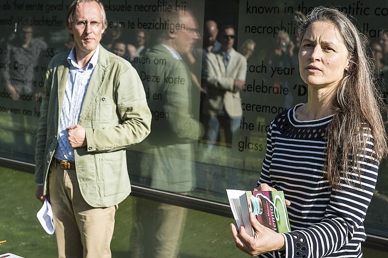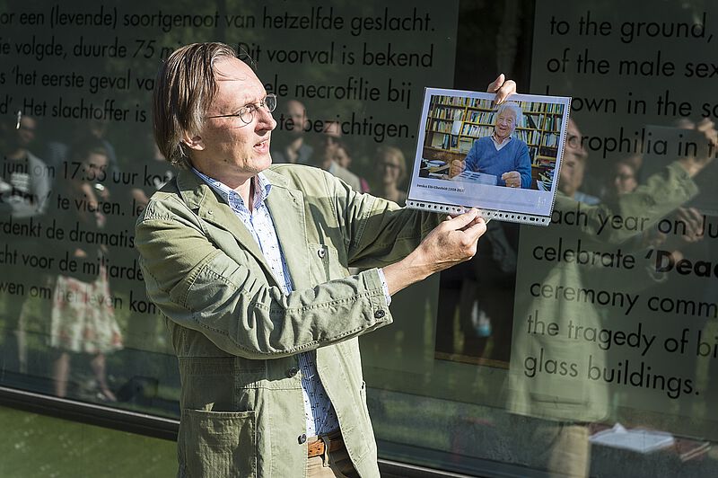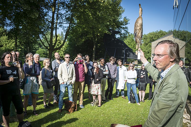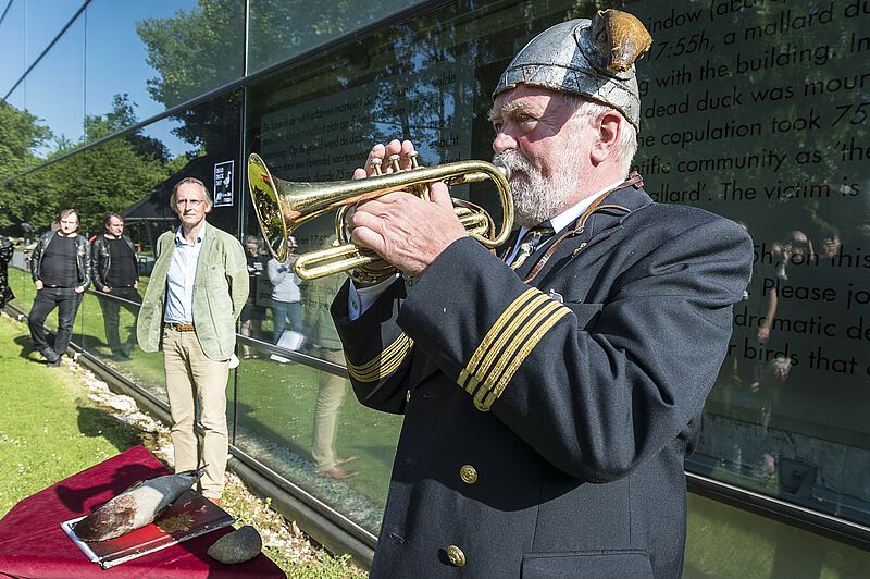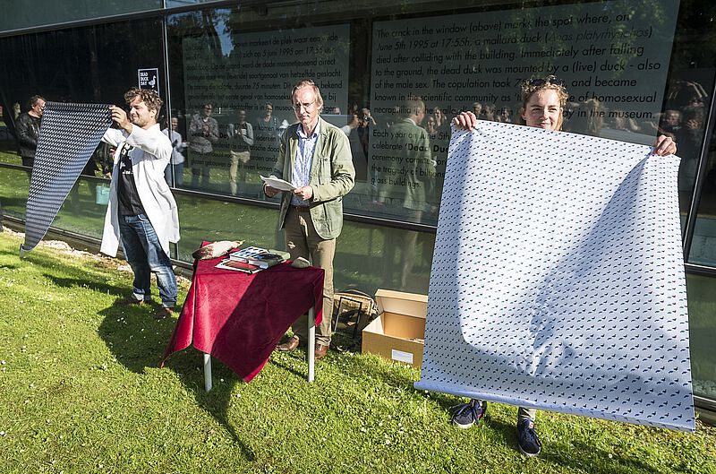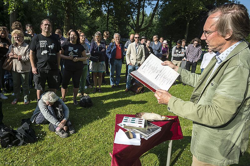 De <link internal-link internal link in current>23e Dead Duck Day, op 5 juni 2018, stond onder andere stil bij de miljarden raamslachtoffers onder vogels en trok 65 belangstellenden uit alle windstreken. Bijzonder was het bezoek van zes leden van de 'Niedersachsen Flugenten- und Sturmboot-Club' uit Bremen en de bijdrage van Eva Menasse (een eendenverhaal uit haar debuutroman 'Vienna') die werd voorgedragen door Kim Zieschang. Ook beleefde het Arnhemse verkeersslachtoffer (en geval van heteroseksuele necrofilie bij de wilde eend) haar eerste publieke optreden. En jawohl - de <link file:1446 download internal link in current>Duitse vertaling van De eendenman werd aangekondigd. Onderstaande foto's zijn gemaakt door Maarten Laupman.