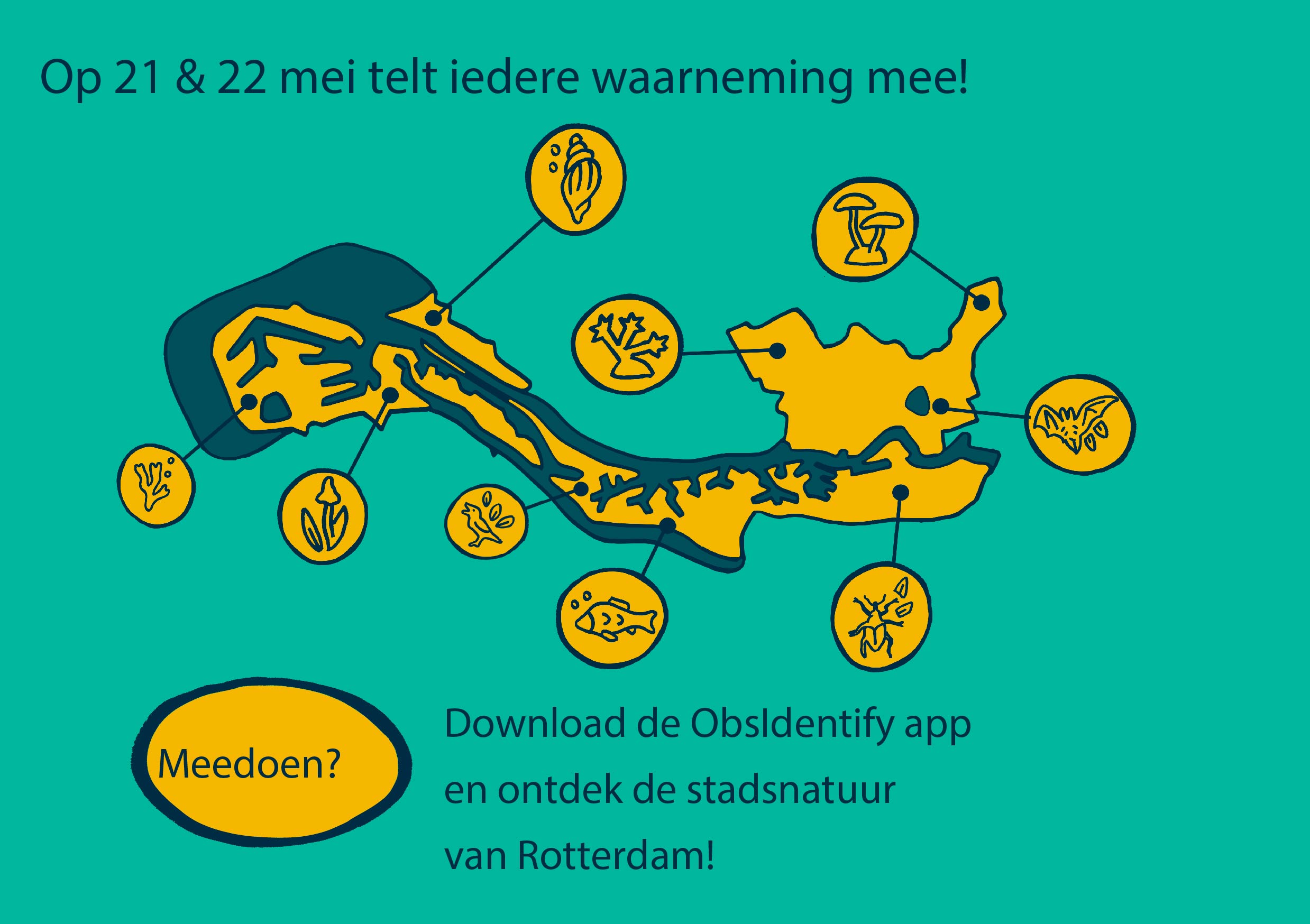 Als je op één van deze twee dagen een soort ziet en deze invoert op Waarneming.nl, draag je automatisch bij. Je kunt overal binnen de Rotterdamse gemeentegrenzen meetellen: van de Maasvlakte en Hoek van Holland helemaal tot aan Nesselande. Wel tellen alleen de wilde soorten, dus je eigen huiskat, exotische tuinplanten of de tijger uit Blijdorp kunnen helaas niet meedoen. Dus, ben jij op 21 of 22 mei 2023 in Rotterdam en zie je een merel in je tuin, parapluutjesmos tussen de tegels, een snoek in de sloot, of een koolwitje in het park, geef het door via Waarneming.nl. Tip: de ObsIdentify app helpt je om vast te stellen met wat voor plant of dier je te maken hebt, en zorgt dat de soorten die je ziet automatisch meedoen aan de Bioblitz. Samen brengen we zo de biodiversiteit van Rotterdam in beeld!