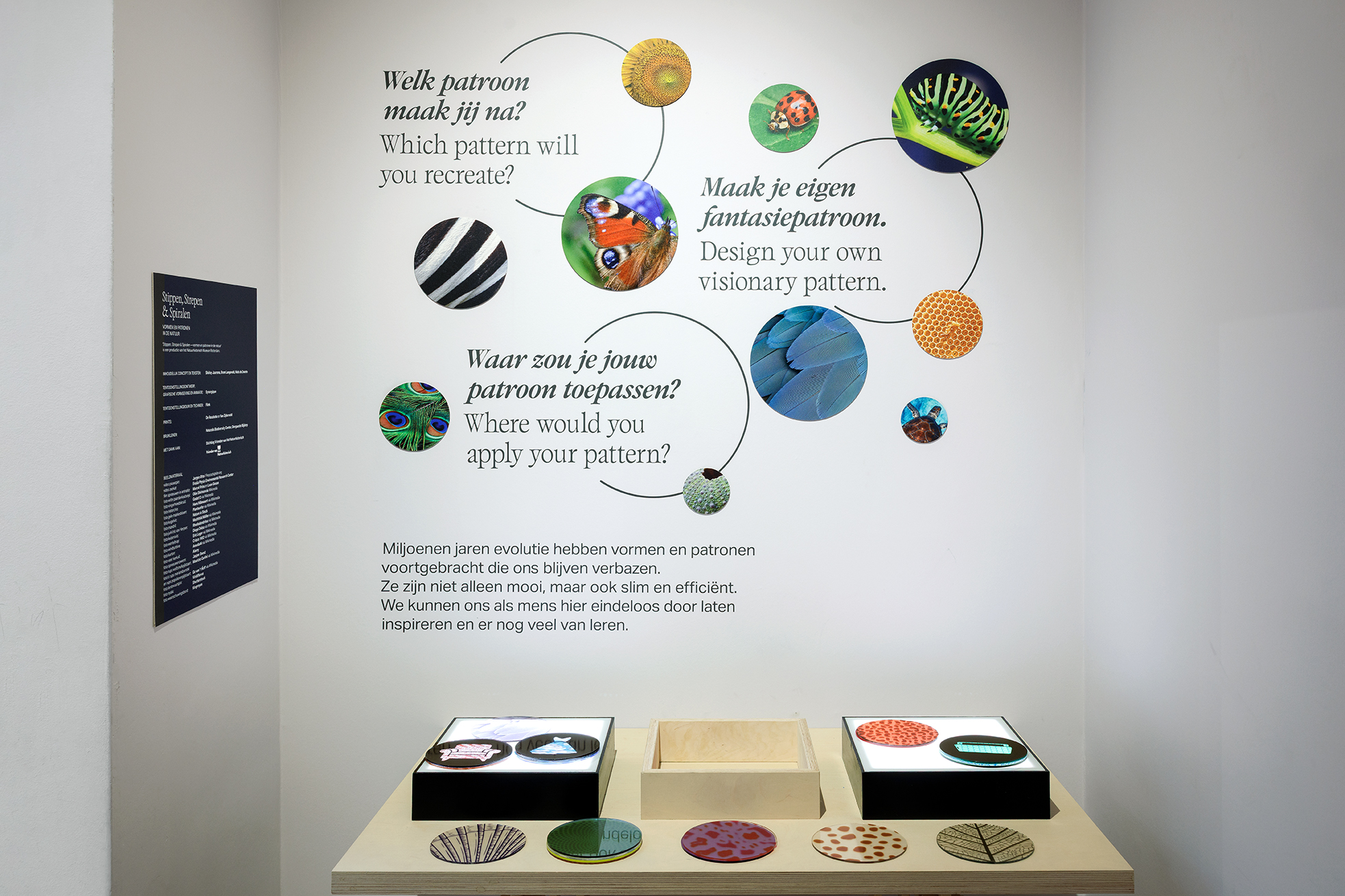 En wist je dat mensen zich al eeuwenlang laten inspireren door de natuur? Natuurlijke patronen duiken op in mode, architectuur, technologie en nog veel meer. Verwonder je in deze tentoonstelling over de verbazingwekkende diversiteit aan patronen in de natuur. Aan de hand van zo'n zestig voorbeelden leer waarom juist deze vormen en kleuren zo effectief zijn voor verleiding, camouflage, stevigheid, efficiëntie of afschrikking en ontdek hoe mensen deze handige patronen kunnen gebruiken. Geïnspireerd geraakt? Ga dan zelf aan de slag en mix en match je eigen fantasiepatroon.