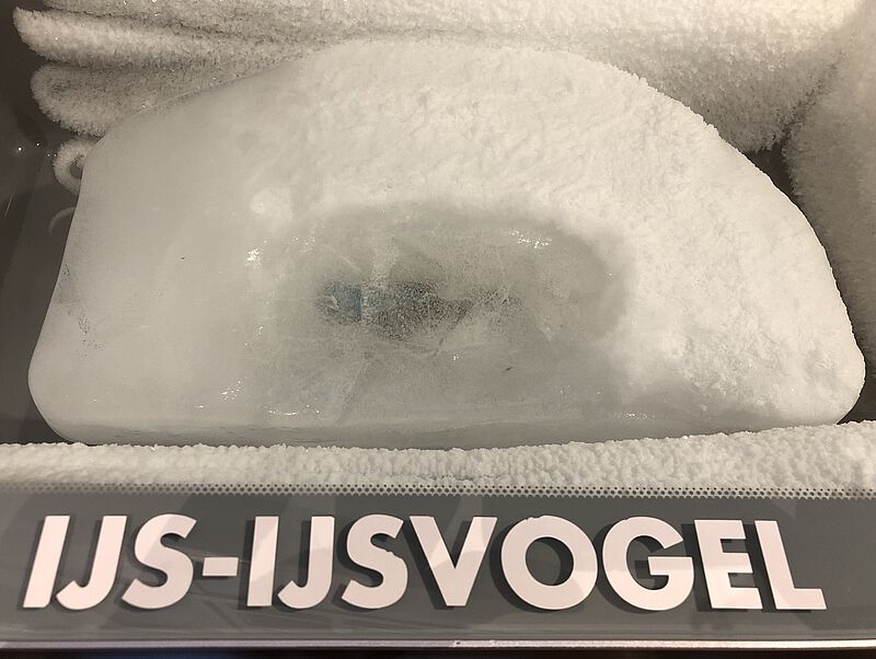 [21 november 2019] De <link internal-link internal link in current>beroemde ijsvogel die het Natuurhistorisch Museum Rotterdam sinds augustus 2018 exposeert in het originele ijs dat hem fataal werd, verdwijnt uit de tentoonstelling 'Dode dieren met een verhaal'. Zondag 24 november 2019 gaat de stekker uit de speciale vries-vitrine en zullen ijs en vogel langzaam ontdooien. Door degradatie van het oorspronkelijk kraakheldere ijs is de vogel niet meer zichtbaar. Museumbezoekers kunnen vanaf 11:00 uur afscheid nemen van de IJs-ijsvogel. Naar verwachting zullen de azuurblauwe veren in de loop van de dag weer zichtbaar zijn.