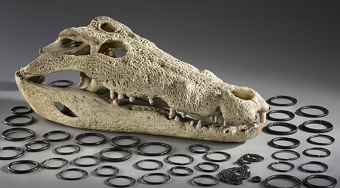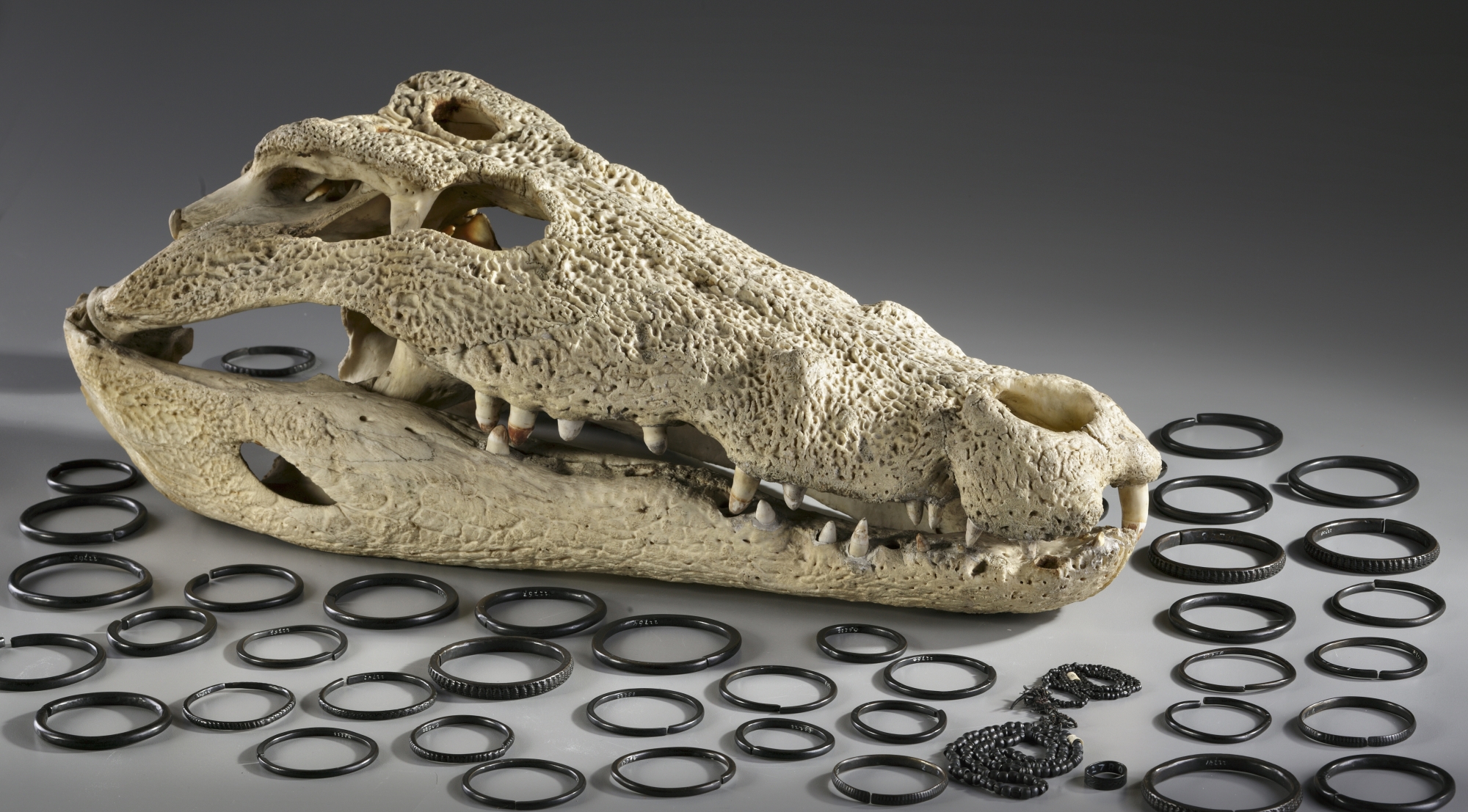 [27 april 2016] Nieuw in de tentoonstelling 'Dode dieren met een verhaal' is de schedel van een Nijlkrokodil (Crocodylus niloticus). Het reptiel werd omstreeks 1910 geschoten ‘wegens onbehoorlijkheden jegens vele inlanders’ langs de Zambesi in Mozambique. De schutter, Rudolph Willem Vroon (1865-1935), schonk behalve de schedel ook de maaginhoud aan het toenmalige Museum voor Land- en Volkenkunde: 42 polsbanden, twee halssnoeren en een ring.