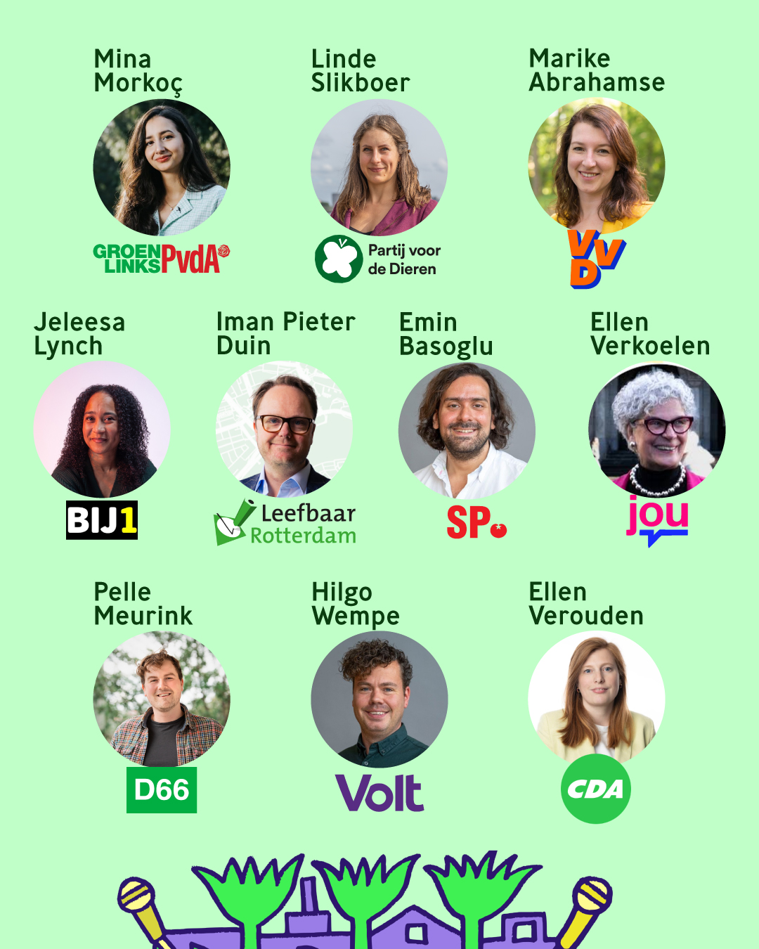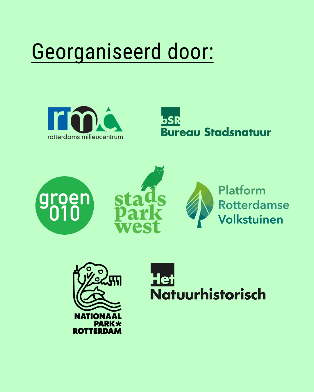 Het verkiezingsdebat Natuur in de Stad wordt georganiseerd door:Stichting Rotterdams Milieu Centrum, Bureau Stadsnatuur, Nationaal Park Rotterdam, Natuurhistorisch Museum Rotterdam, Platform Rotterdamse Volkstuinen, Stadspark West, en Vereniging Groen 010.