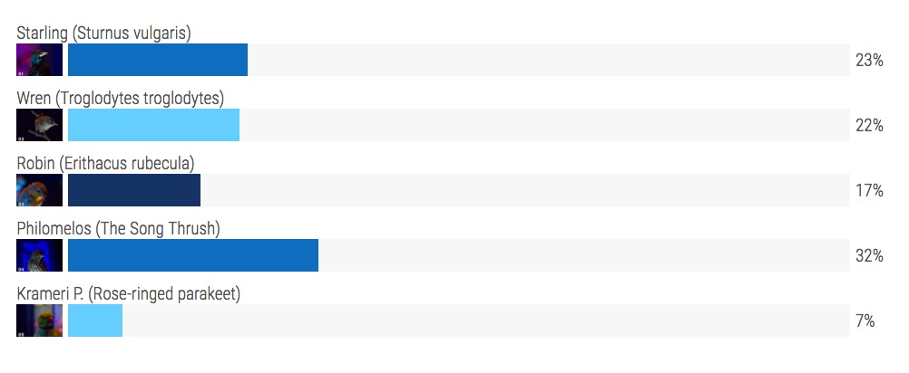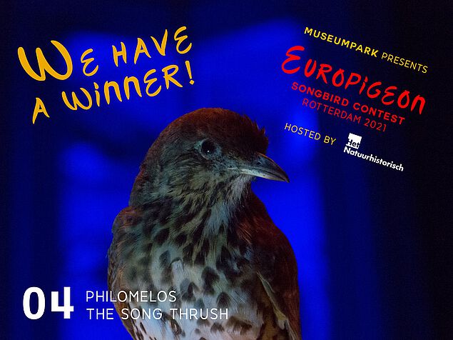[22 mei 2021] De zanglijster is de winnaar van de Europigeon Songbird Contest 2021. Met 32% van de stemmen liet deze zangvogel de spreeuw (23%) overtuigend achter zich. Hoorbaar teleurgesteld was de winterkoning, met 22% van de stemmen. De roodborst was ontroostbaar op plek vier (17%). Op de vijfde en laatste plaats eindigde de halsbandparkiet (7%), een logisch gevolgd van zijn positie als underdog want parkieten zijn geen zangvogels.