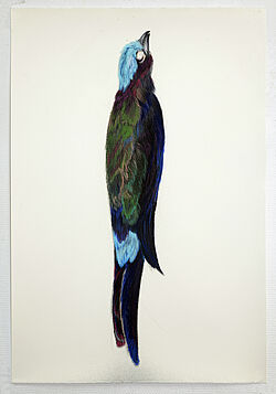> Sulawesischarrelaar – purple-winged roller – Coracias temminckii. (pastelkrijt op papier, 52x76 cm; Roos Holleman)