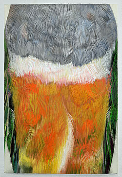 > geelkraagparadijsvogel – magnificent bird-of-paradise – Cicinnurus magnificus. (pastelkrijt op papier, 52x76 cm; Roos Holleman)