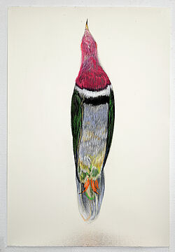 > Wallace’ jufferduif – Wallace’s fruit-dove – Ptilinopus wallacii. (pastelkrijt op papier, 52x76 cm; Roos Holleman)