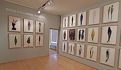 > Roos Holleman: "De werken exposeer ik in een groot grid, een soort installatie, een ode aan de diversiteit van soorten maar ook een reflectie op de kunst van het ordenen en de menselijke verzameldrift." (Kees Moeliker)