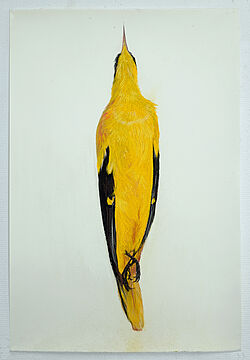 > Chinese wielewaal – black-naped oriole – Oriolus chinensis broderipi. (pastelkrijt op papier, 52x76 cm; Roos Holleman)