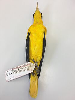 > Chinese wielewaal (Oriolus chinensis broderipi), in 1856 door Wallace verzameld op Lombok; balg, collectie The Natural History Museum, NHMUK 73.5.12.1160. (foto Alexander Reeuwijk)