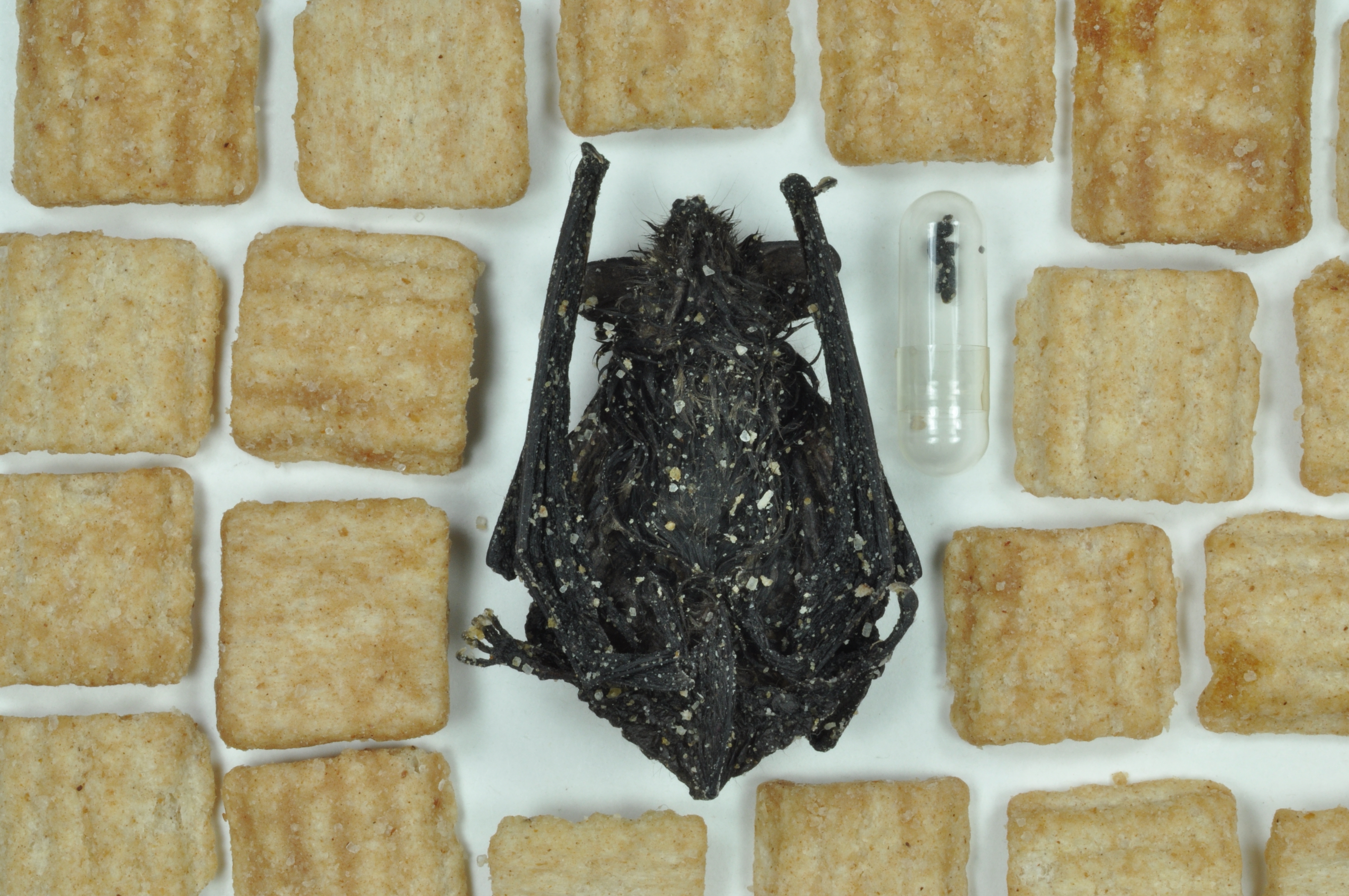De Frühstücksvleermuis samen met de zoutjesmuis, de pasgeboren huismuis (Mus musculus) die zomer 2012 in een zak knabbelzoutjes werd gevonden. [Collectie Natuurhistorisch Museum Rotterdam, NMR 9990-03095]