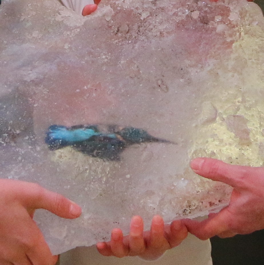 > Het ijsblok met ijsvogel tijdens de overdracht aan Het Natuurhistorisch, op 13 maart 2018. (foto Bram Langeveld)