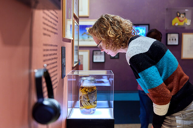 > Bezoeker in de tentoonstelling 'Van Muis naar Mickey'. (Aad Hoogendoorn)