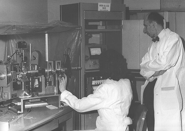 > Leo Vroman met onderzoeksassistente Ann Adams en ellipsometer in het lab van het Veterans Administration Hospital in Brooklyn, 1963. (collectie Vroman Foundation)