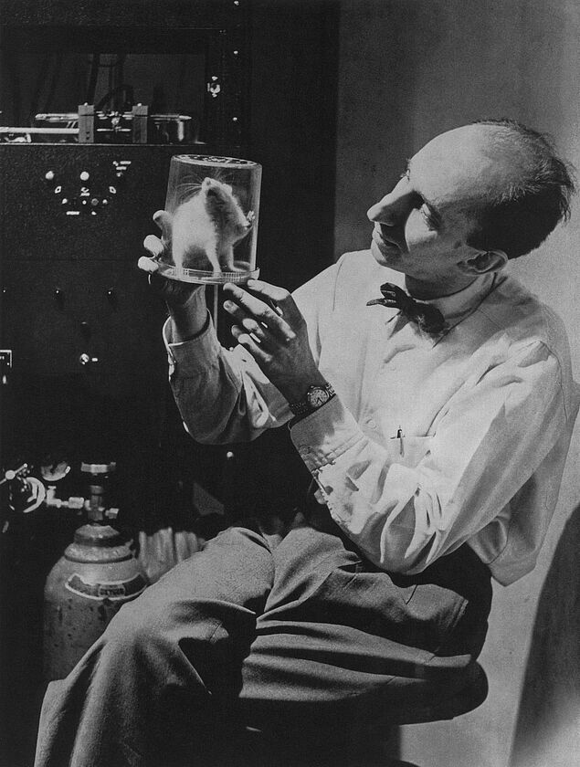 > Leo Vroman met laboratoriumrat; Department of Animal Behaviour, American Museum of Natural History, New York, 1959. (foto Charlie Robach)