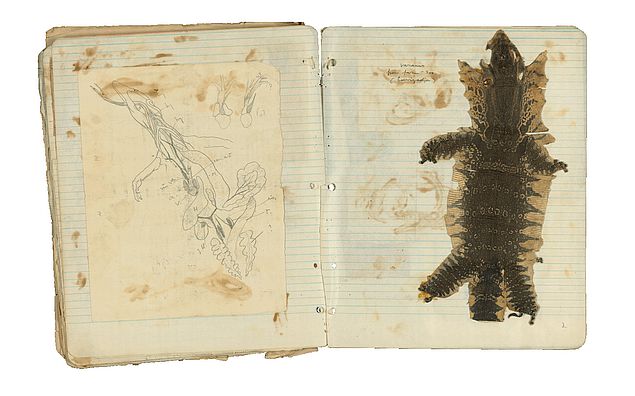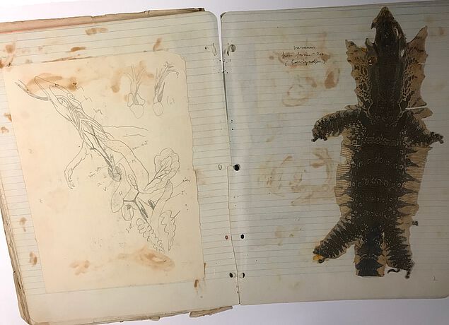 > Kampdagboek Leo Vroman met huid varaan en schets van de anatomie, 1943. (collectie Literatuurmuseum)