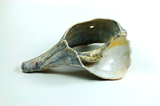 > Slakkenhuis van Busicon carica; zwaar beschadigd exemplaar, gevonden door Leo Vroman op Plum Beach, New York. (collectie Vroman Foundation)