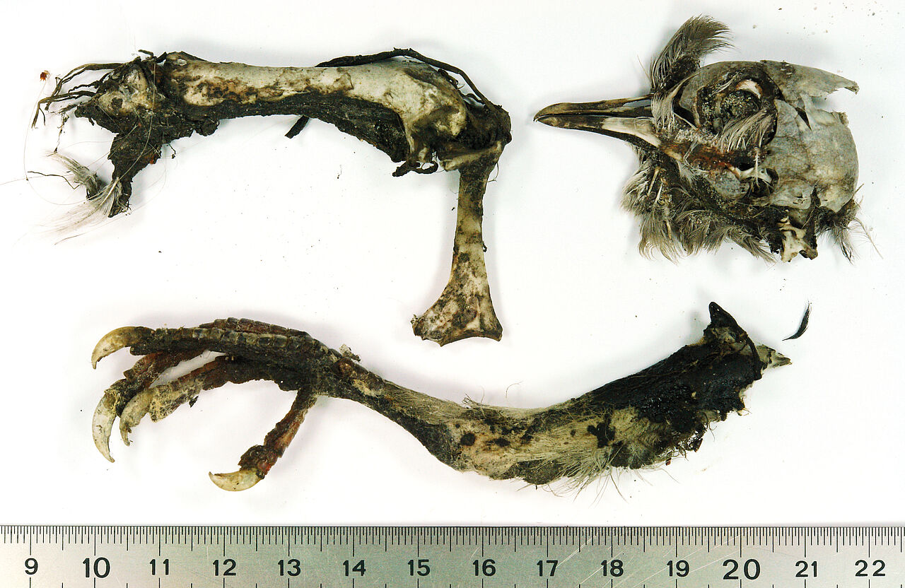 Prooiresten van de slechtvalk, gevonden op de Willemsbrug: kop van een Turkse tortel [rechts], poot [onder] en opperarmbeen [links] van een stadsduif. (Kees Moeliker)